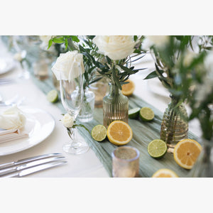 テーブルランナー(左上:チーズクロス、右上:チーズクロス(ダスティ―ブルー)、右下:リネンタイプ、左下:リネンタイプ(シャンパンベージュ))