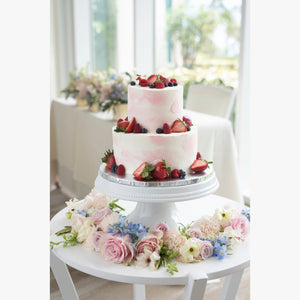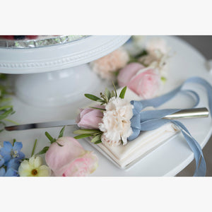 ウェディングケーキを彩る生花でのデコレーション。ケーキカットはお写真にも残るシーンなので、ナイフフラワーとマッチングさせて華やかに。