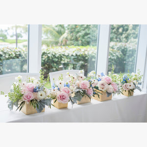 列席者様が着席されるテーブルの上を生花で飾り付けます。列席者様の近くに飾るのでおもてなしを兼ねて。