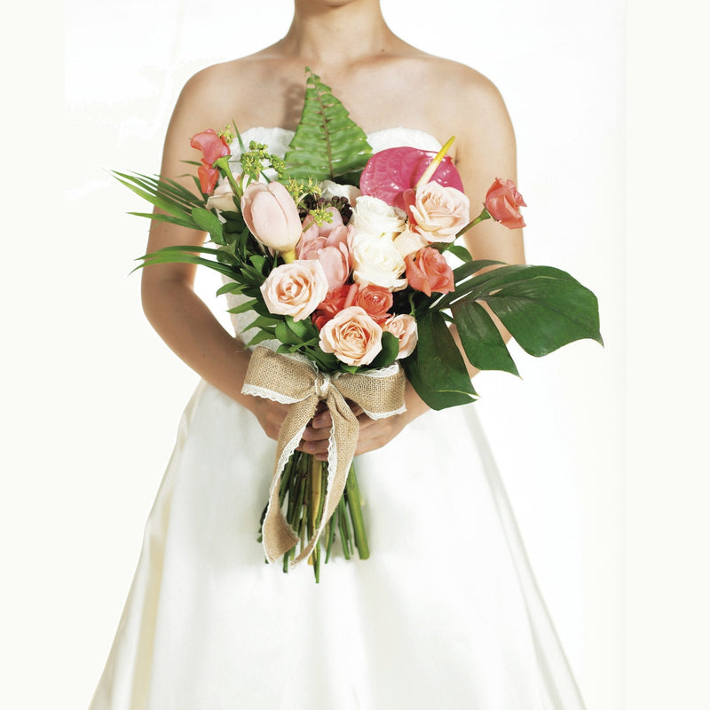 存在感のあるミックスローズに、トロピカルグリーンをアクセントに周りをあしらいました。 南国のガーデンから届けられたようなみずみずしい印象のブーケです。